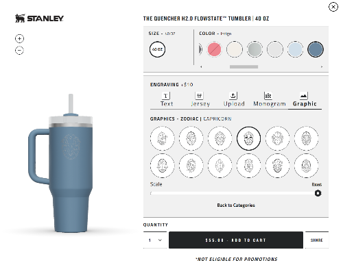 링크로 들어가면 스탠리 텀블러 중 하나인 퀜처 40oz의 커스텀 페이지로 접속된다