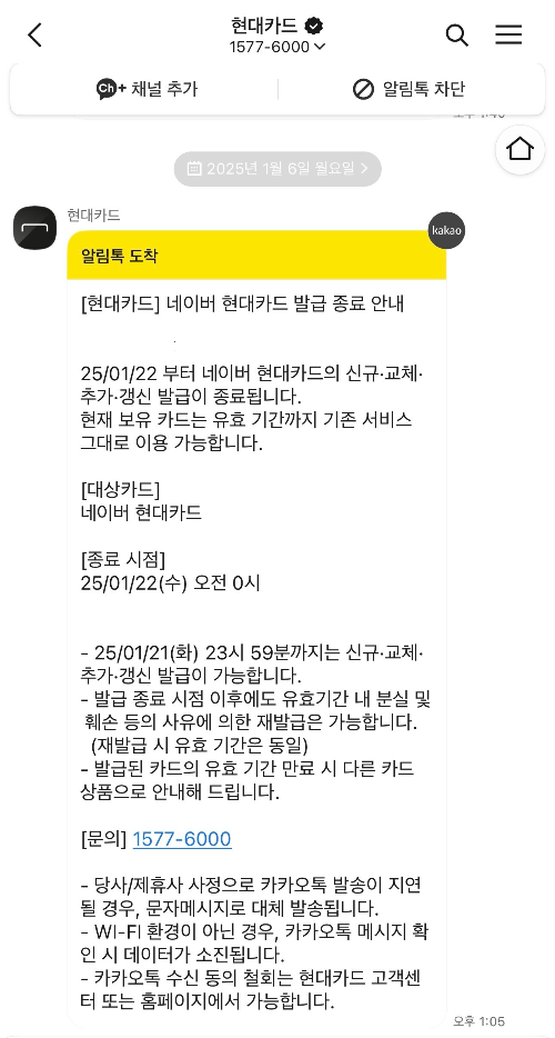 사용 금액의 1%가 네이버페이 포인트로 매달 15일 적립되는데 이걸로 한 달 동안 커피 사 마실 정도로 잘 쓰고 있던 어느 날, 1월 6일 이런 카카오톡 메시지가 날아오는데...