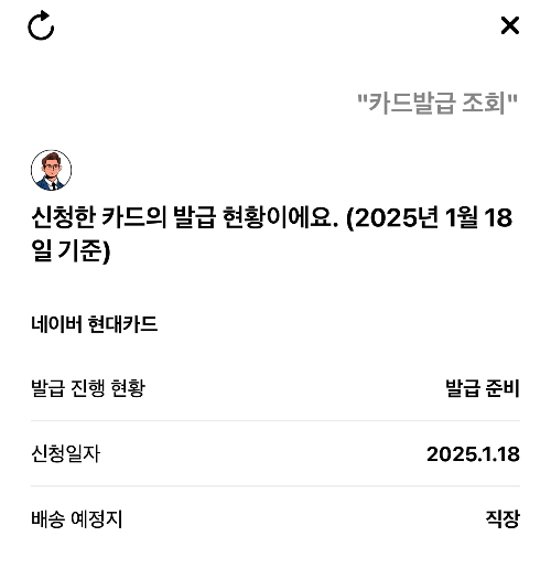 카드 재발급 메뉴를 누르면 자동으로 카드 재발급해줘라는 메시지가 헨리에게 발송된다