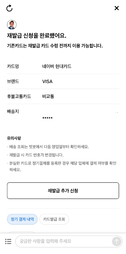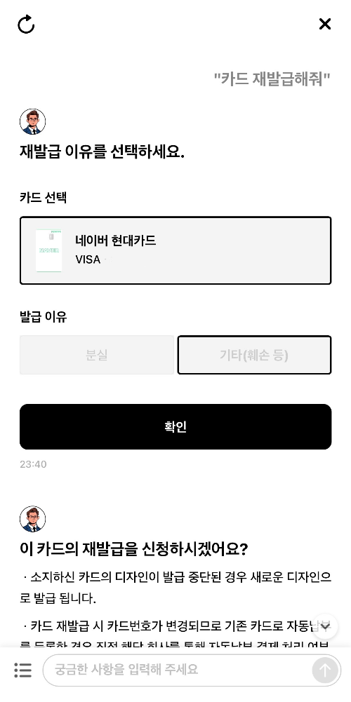 카드 재발급 메뉴를 누르면 자동으로 카드 재발급해줘라는 메시지가 헨리에게 발송된다